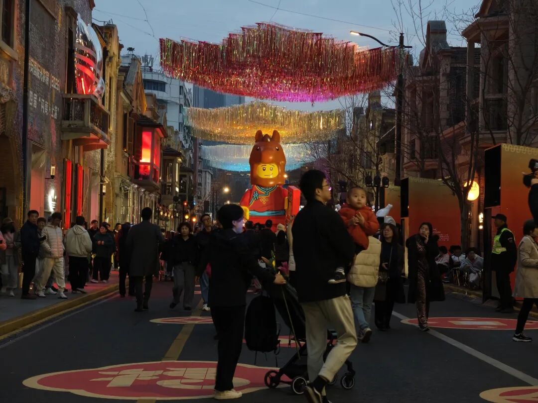 沿着南京西路走去,沿线的全息球灯内,徐悲鸿IP衍生的彩色奔马正在光影中跃动;巨鹿路的路面上,藏着“光影彩蛋”;久光步行街的灯帘装饰与新春市集连成一片,光影与烟火气相映成趣。