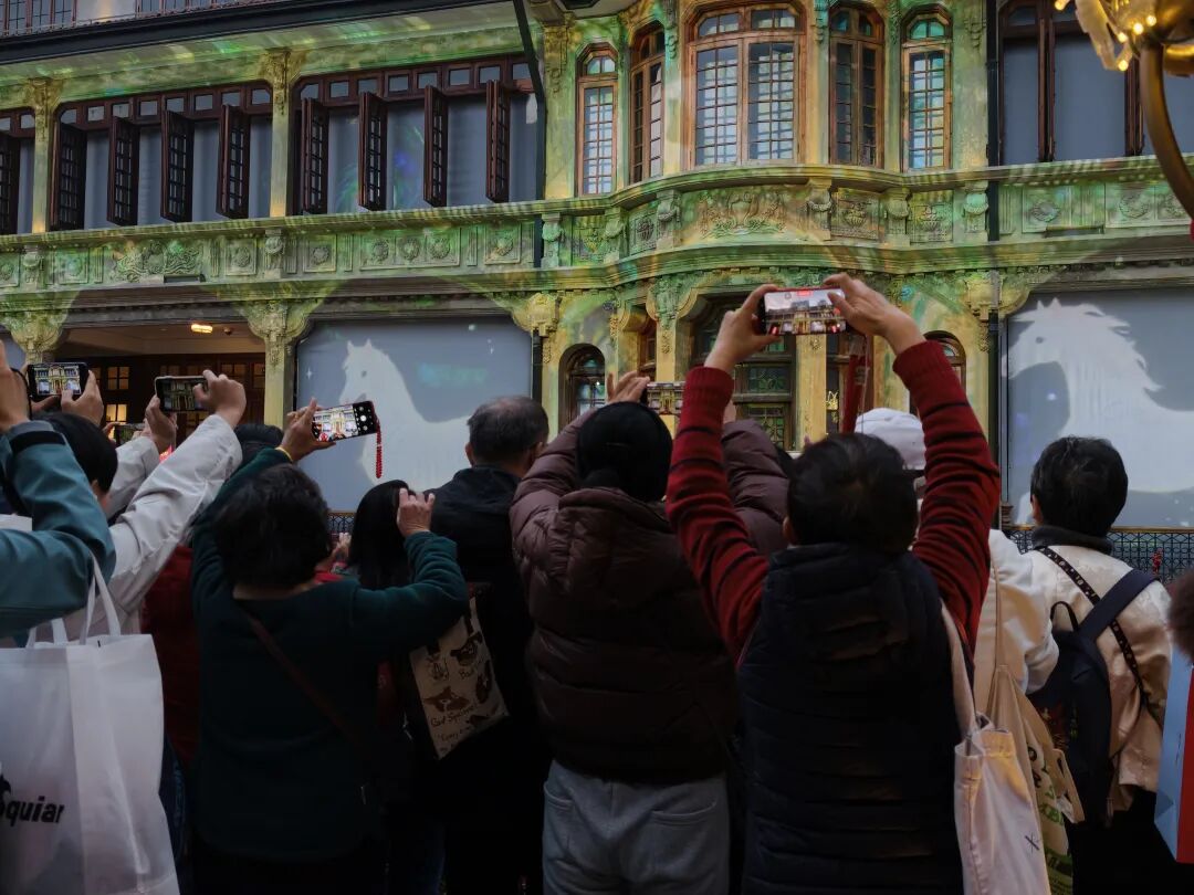 从墙面、地面,到今晚无数人仰望的“城市天空”,光影的边界在不断拓展,而人们也在这片流光溢彩中,收获了更多值得驻足停留的时刻——有人牵着孩子的手,教他辨认头顶的吉祥纹样;有人挽着远道而来的父母,把新年的第一份惊喜分享给最亲的人;也有人只是静静站着,让光影落满肩头,感受这座城市独有的温柔与浪漫。